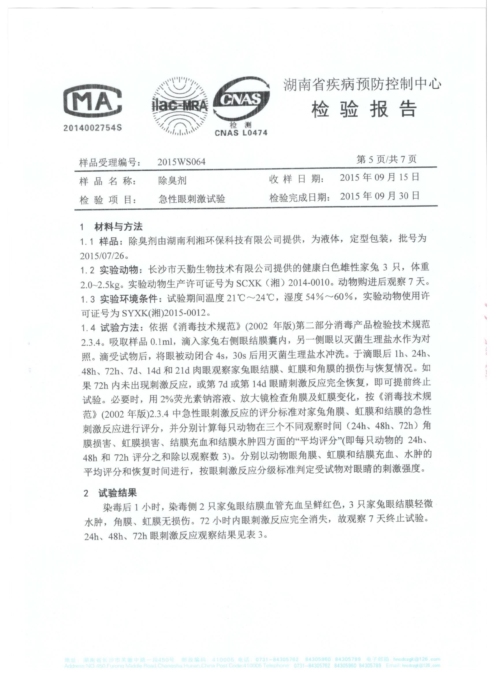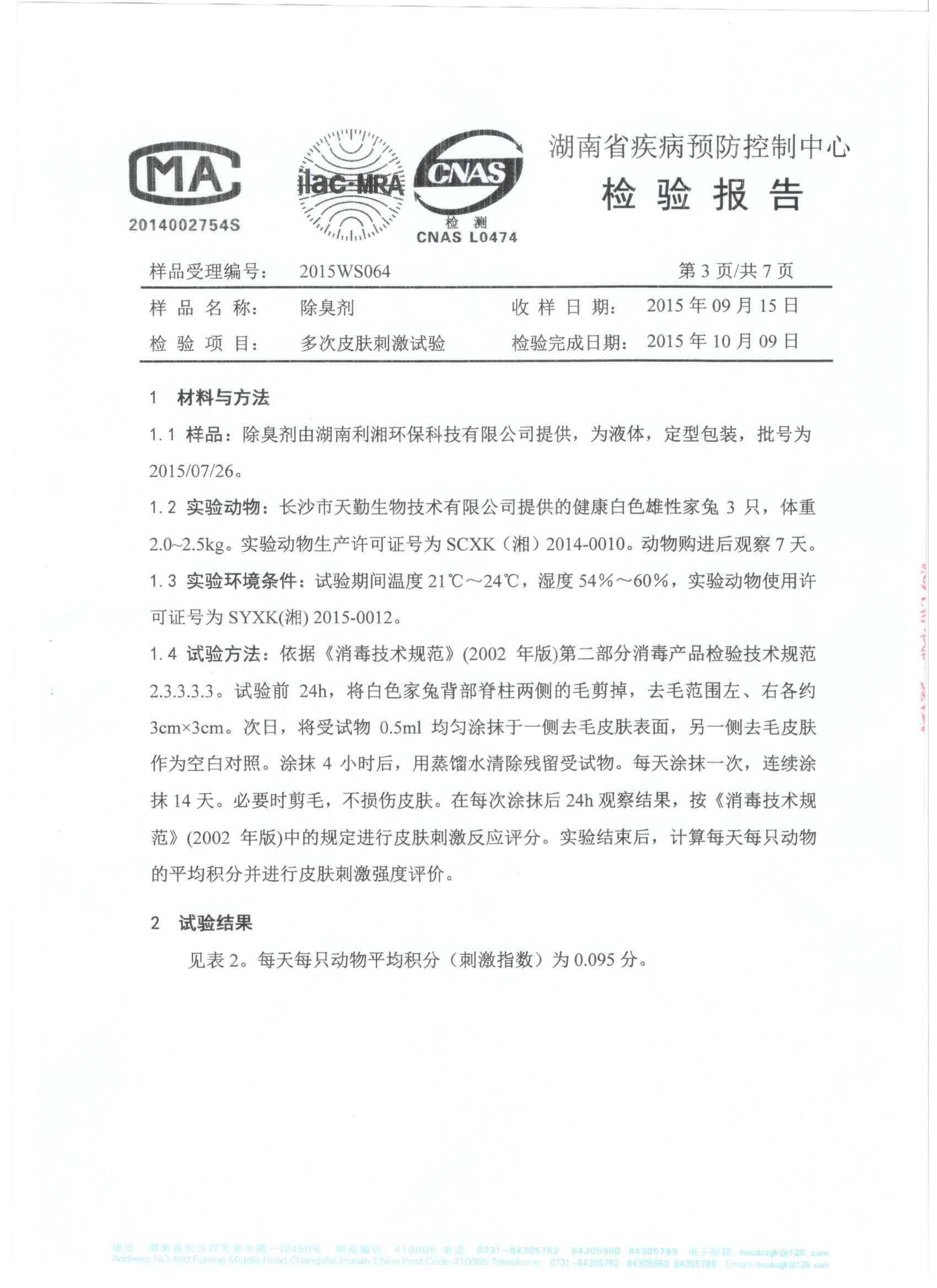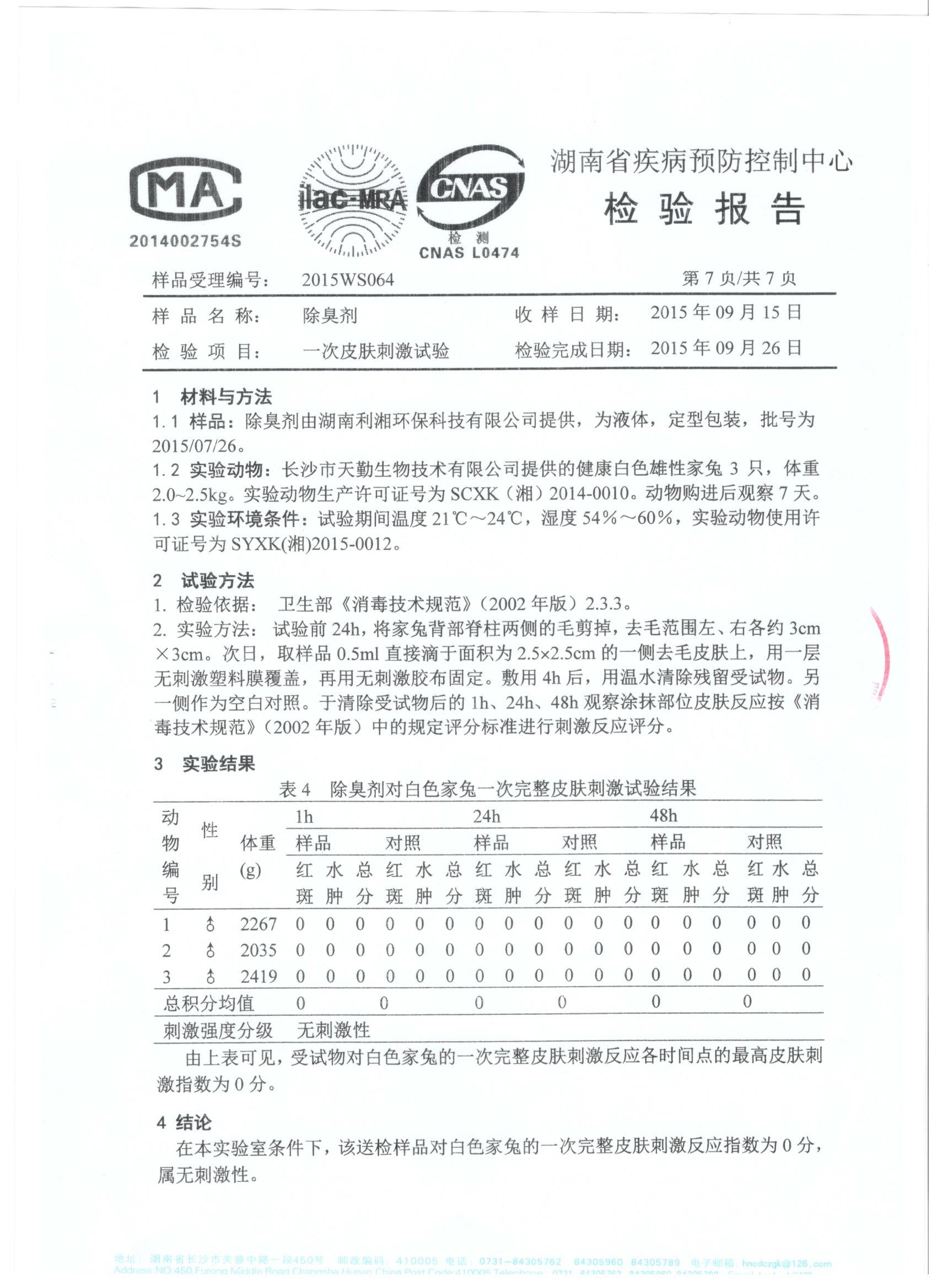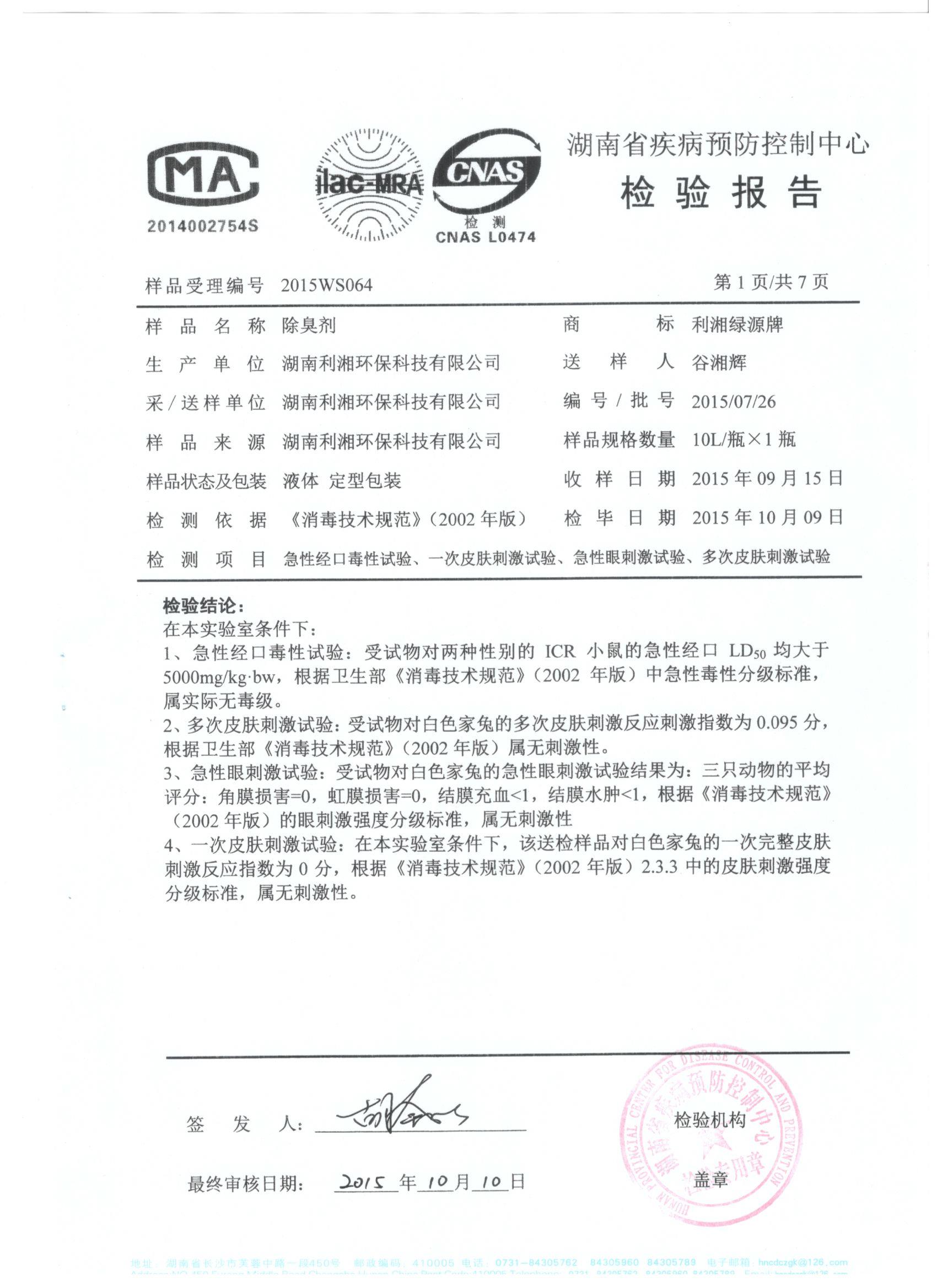 于2015年10月19日完成檢驗并取回檢測報告。根據(jù)試驗結(jié)果和衛(wèi)生部《消毒技術(shù)規(guī)范》(2002年版)中的急性毒性分級標(biāo)準(zhǔn)、皮膚刺激強度分級標(biāo)準(zhǔn)、眼刺激強度分級標(biāo)準(zhǔn),得到的檢測報告結(jié)論確定我司生產(chǎn)的利湘綠源牌生物除臭劑屬實際無毒級,并對皮膚、眼均屬無刺激性。