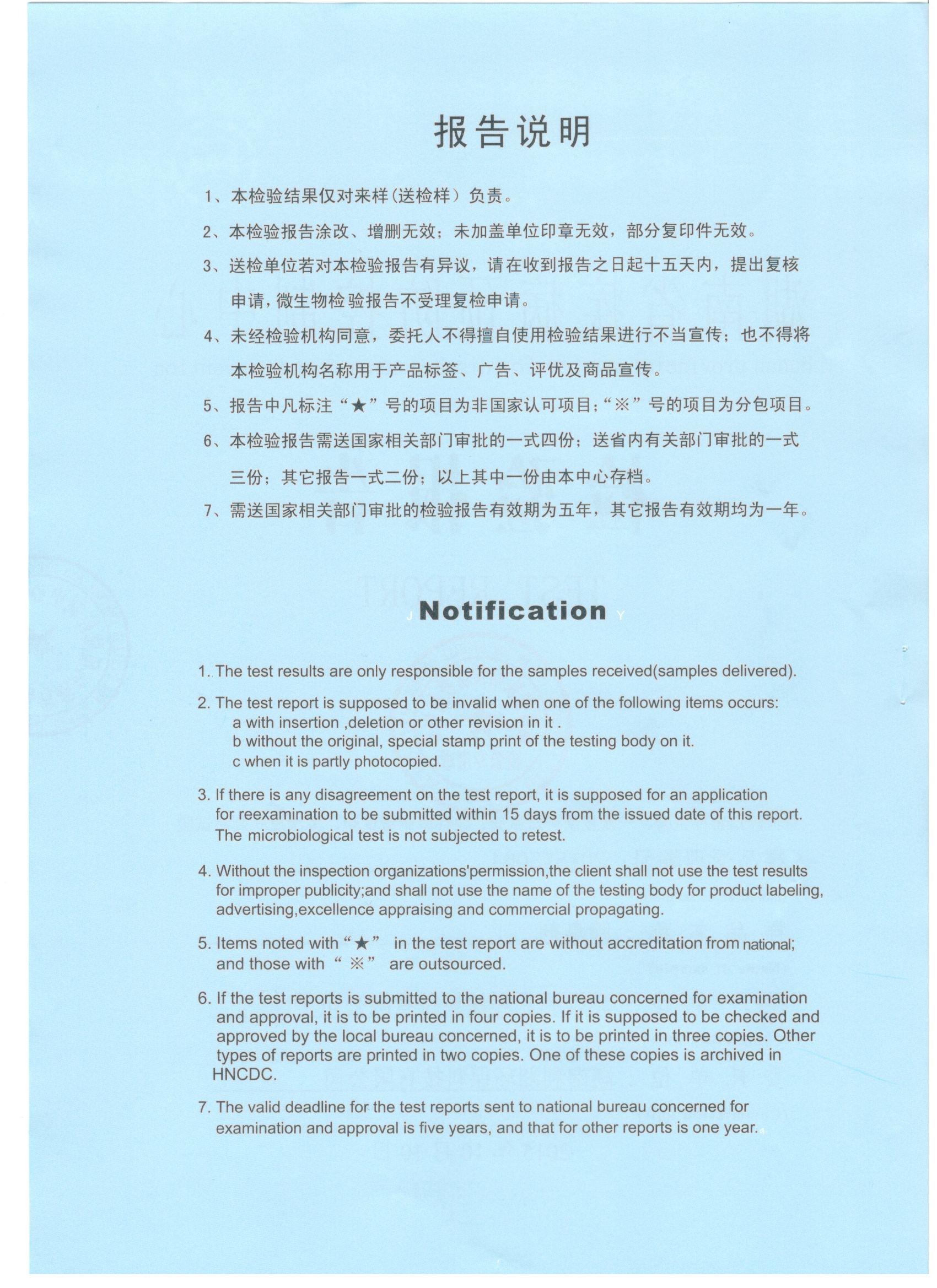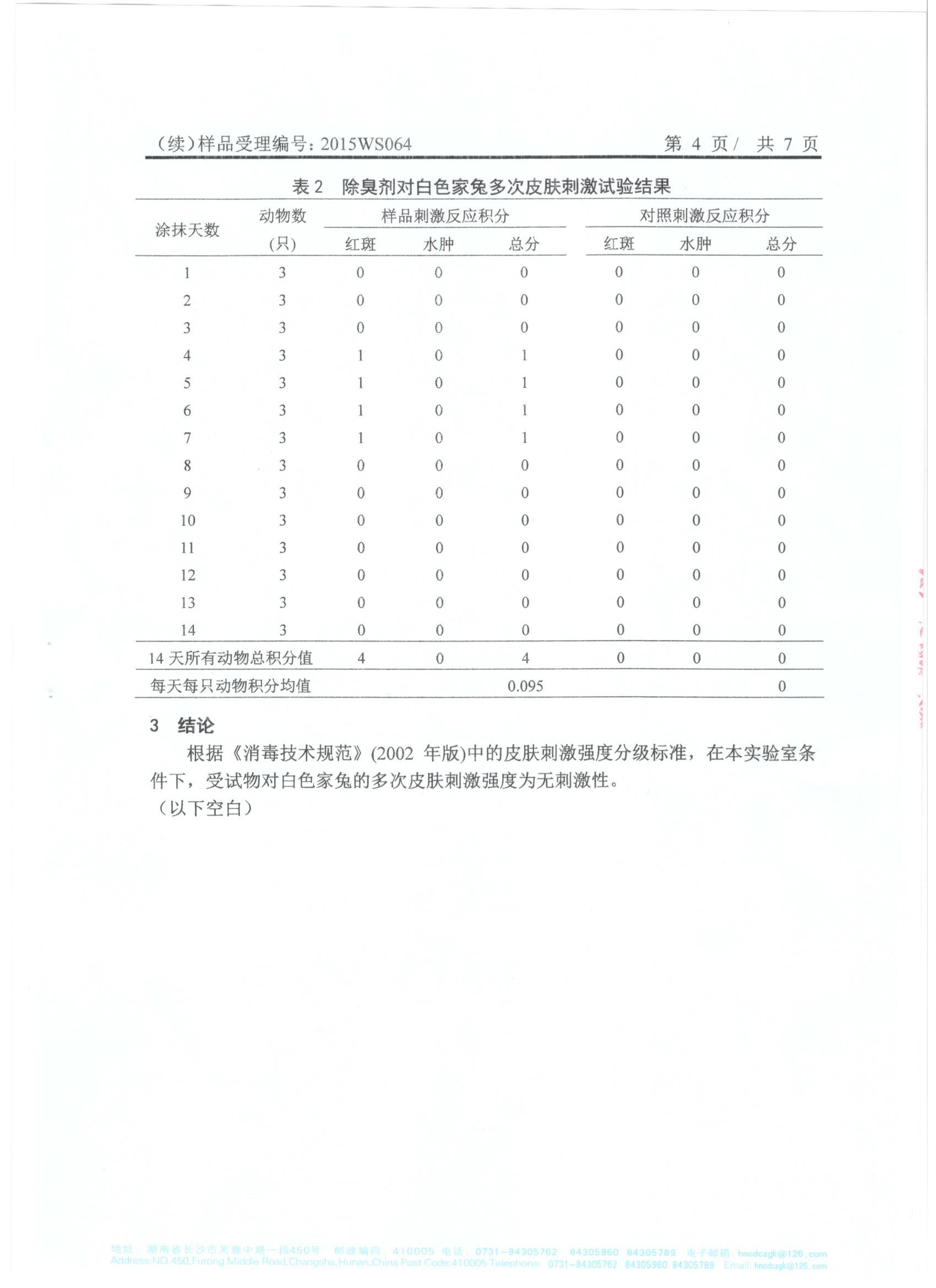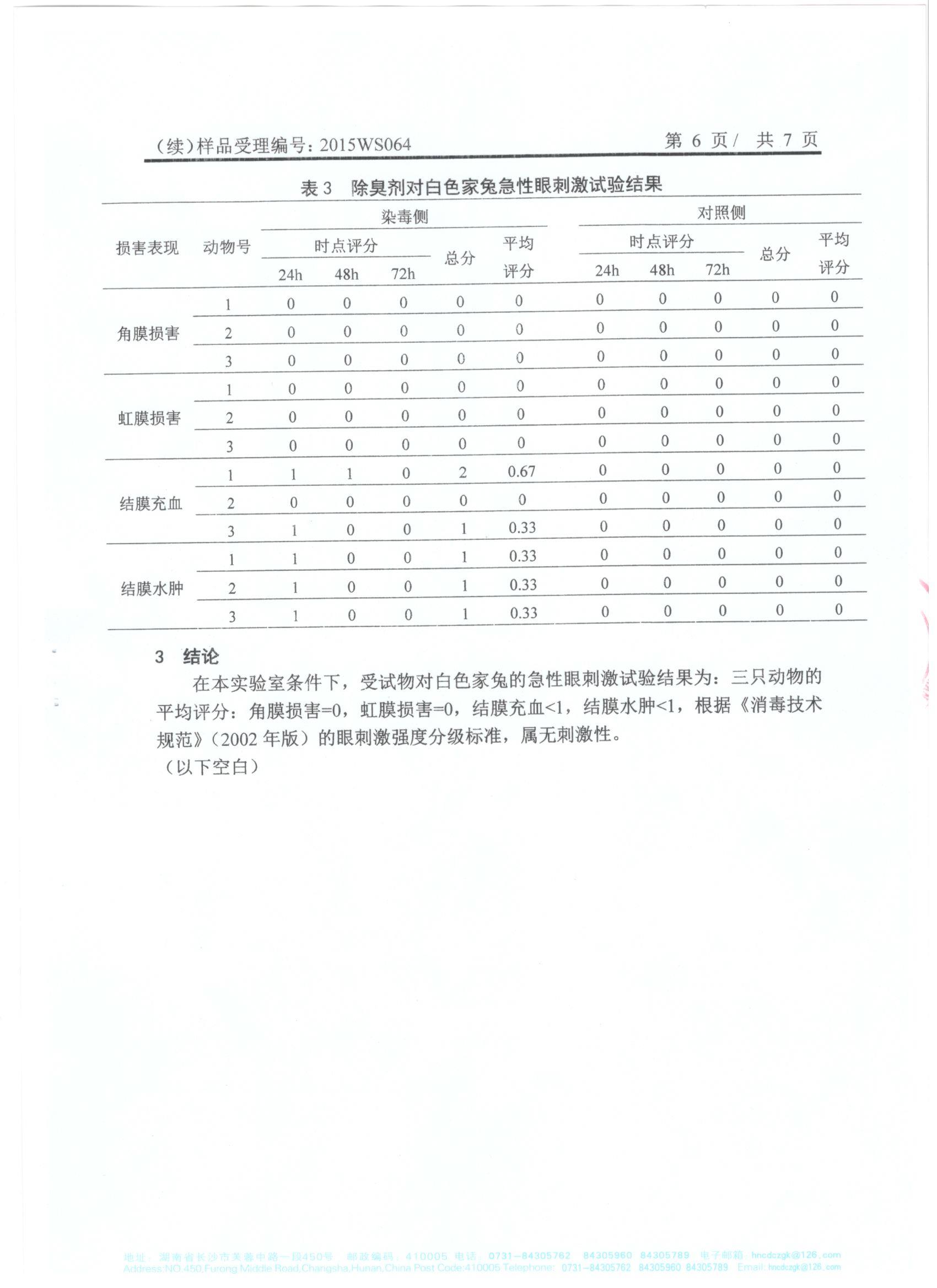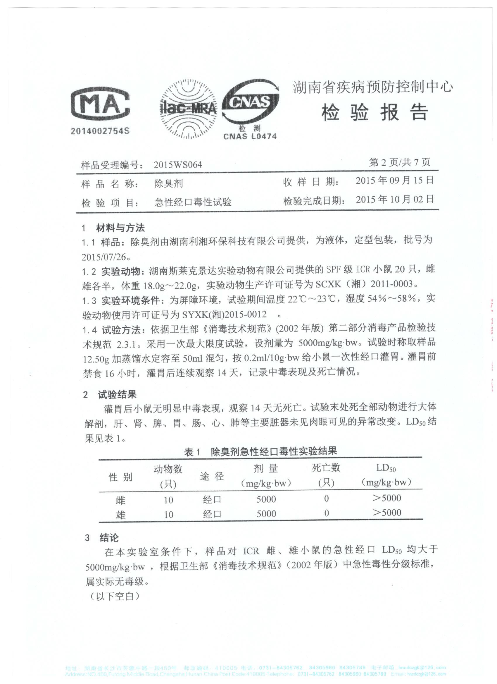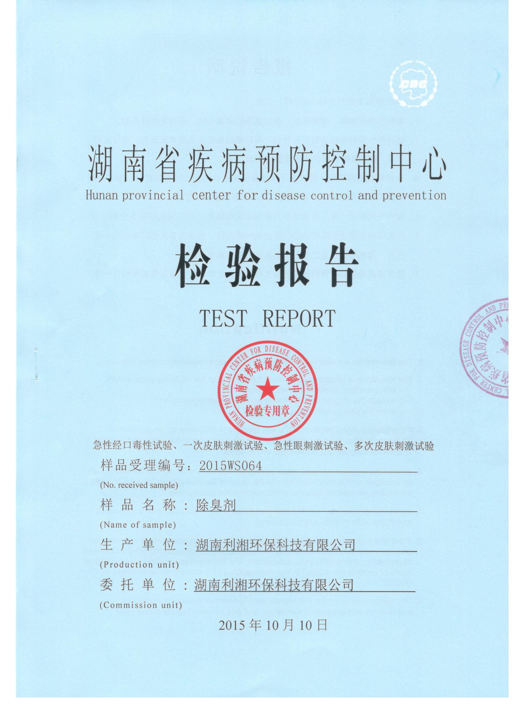 于2015年10月19日完成檢驗并取回檢測報告。根據(jù)試驗結(jié)果和衛(wèi)生部《消毒技術(shù)規(guī)范》(2002年版)中的急性毒性分級標(biāo)準(zhǔn)、皮膚刺激強度分級標(biāo)準(zhǔn)、眼刺激強度分級標(biāo)準(zhǔn),得到的檢測報告結(jié)論確定我司生產(chǎn)的利湘綠源牌生物除臭劑屬實際無毒級,并對皮膚、眼均屬無刺激性。
